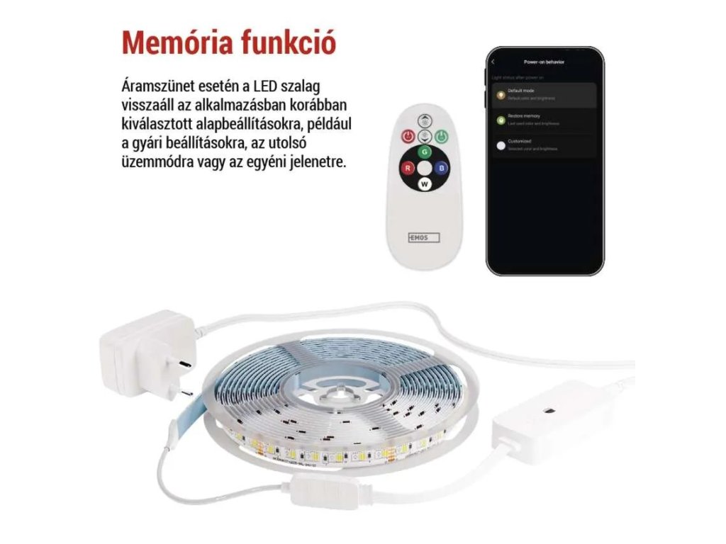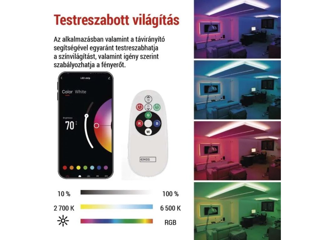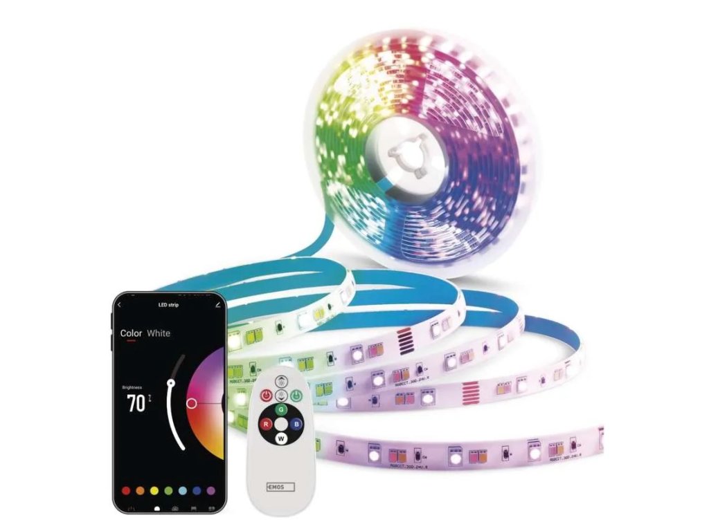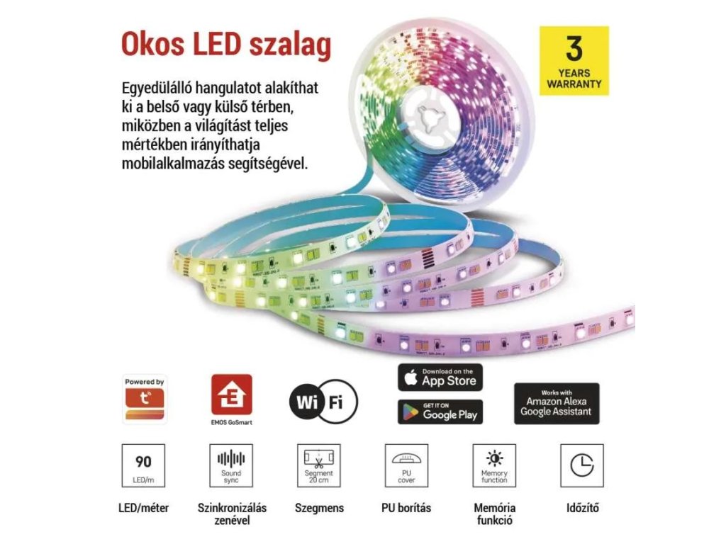 A LED-szalag vezérlése egyszerű a EMOS GoSmart és TUYA mobilalkalmazásokon, vagy az Amazon Alexa és Google Assistanthangasszisztenseken keresztül. Különböző világítási jeleneteket, időzítéseket állíthat be, szinkronizálhatja a világítást zenére, vagy létrehozhat saját dinamikus effektusokat.