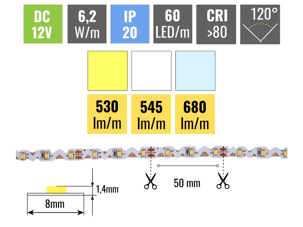 A 6,2W/m teljesítményű szalag akár 680lm/m fényt is kibocsát. A LED diódák sűrűsége 60db/m, ennek köszönhetően a szalag teljes hosszában egyenletesen világít. Ezt a szalagot nem kell alumínium sínbe ragasztani, mégis javasoljuk ennek a lépésnek a megfontolását. Minden szalagunk 3M 300LSE öntapadó fóliával van ellátva, amely kiválóan tapad az alaphoz. Az alapnak simának kell lennie és a szalag felragasztása előtt alaposan zsírtalanítani kell.