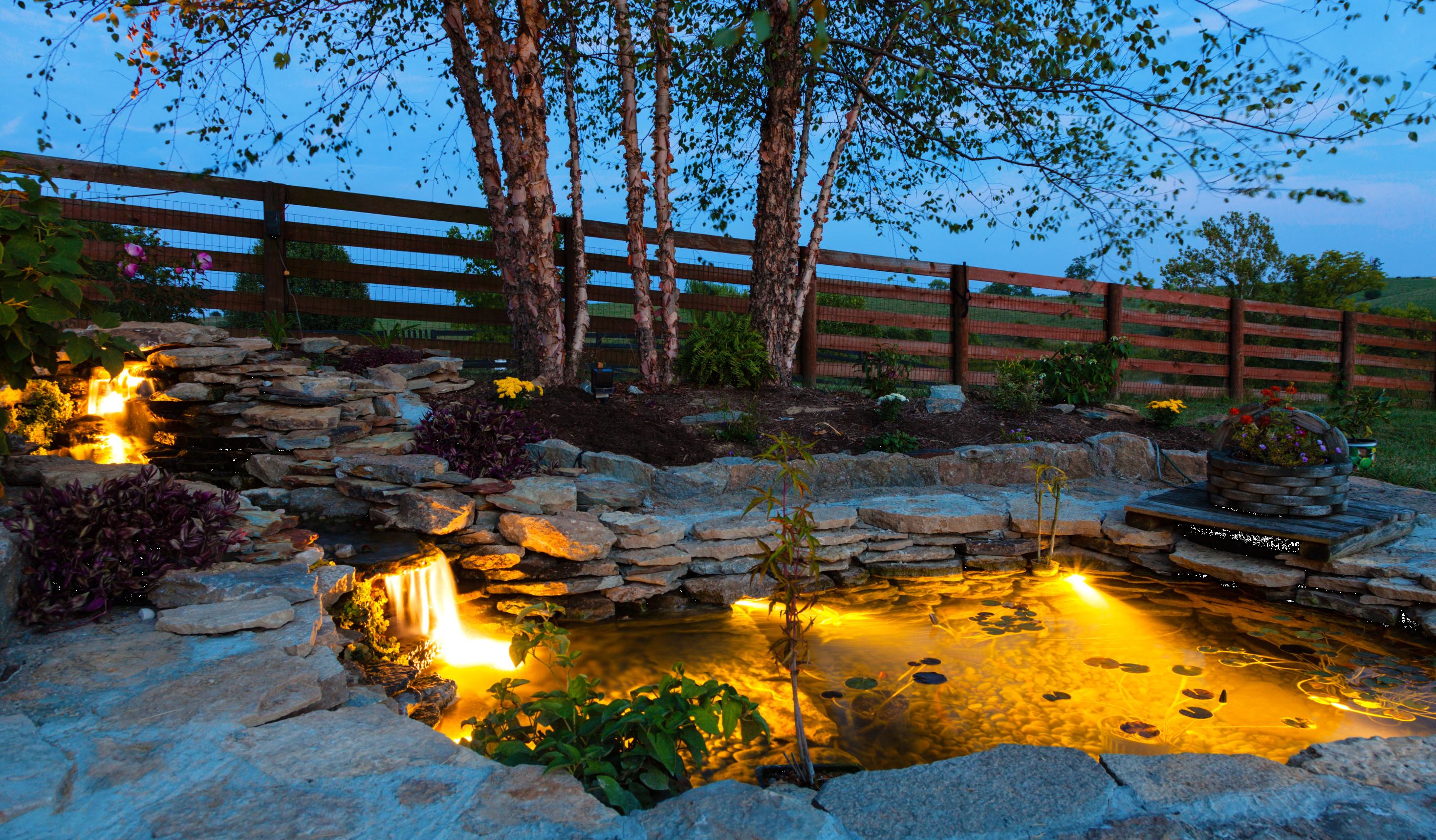 A tó vagy szökőkút megvilágítása vonzó megjelenést kölcsönöz a kertnek, és növeli a biztonságát és használhatóságát. Megakadályozhatja a véletlen vízbeesést, miközben nyugodt, pihentető hangulatot teremt a vízparti esti pihenéshez.