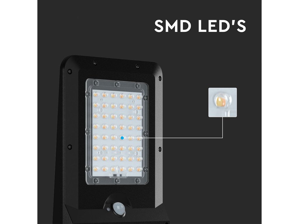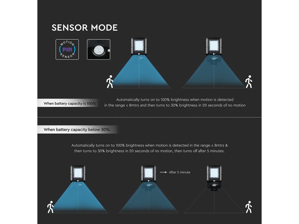A PIR-érzékelő mozgást érzékel 3–8 méteres hatótávolságon belül, 120°-os szögben, automatikusan teljes teljesítményre kapcsolja a lámpát, majd energiatakarékos üzemmódra vált. Ha az akkumulátor kapacitása 30% alá csökken, a lámpatest egy idő után még energiatakarékosabb üzemmódra kapcsol, hogy a lehető leghosszabb üzemidőt biztosítsa.