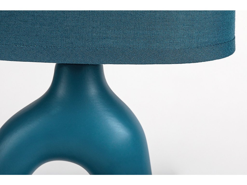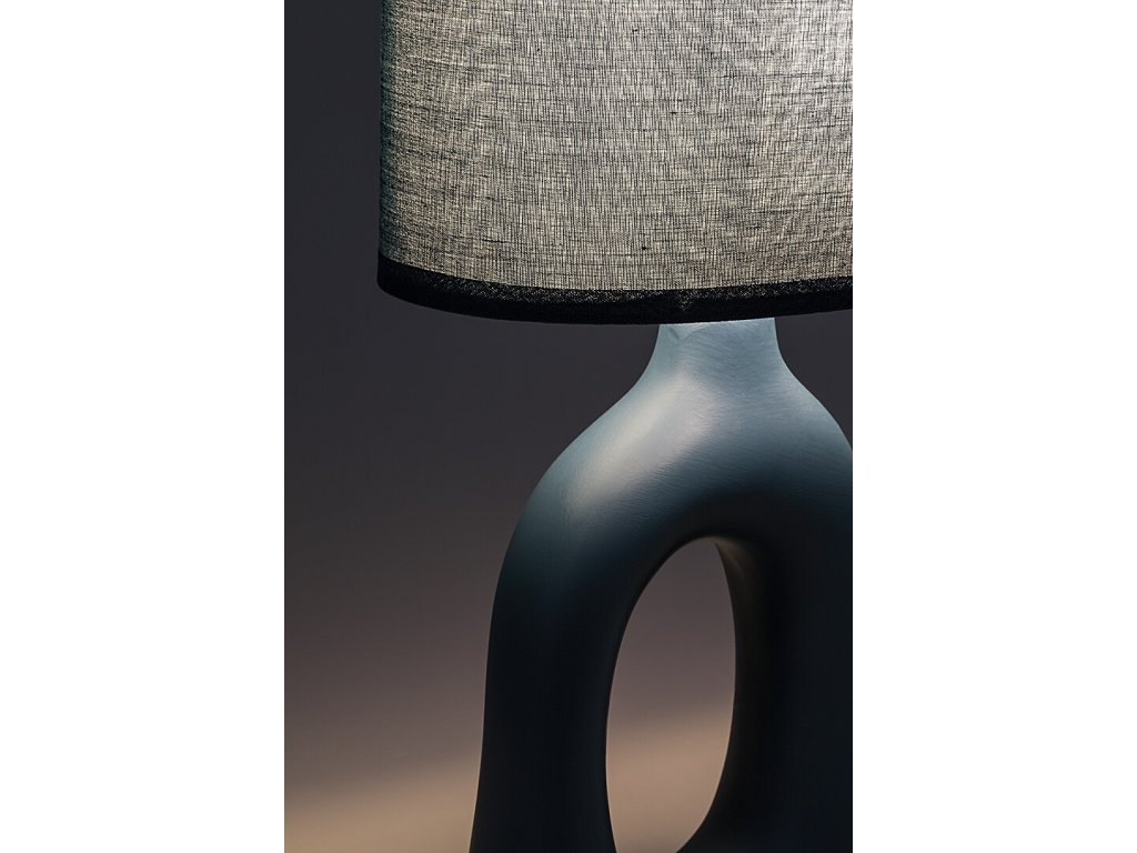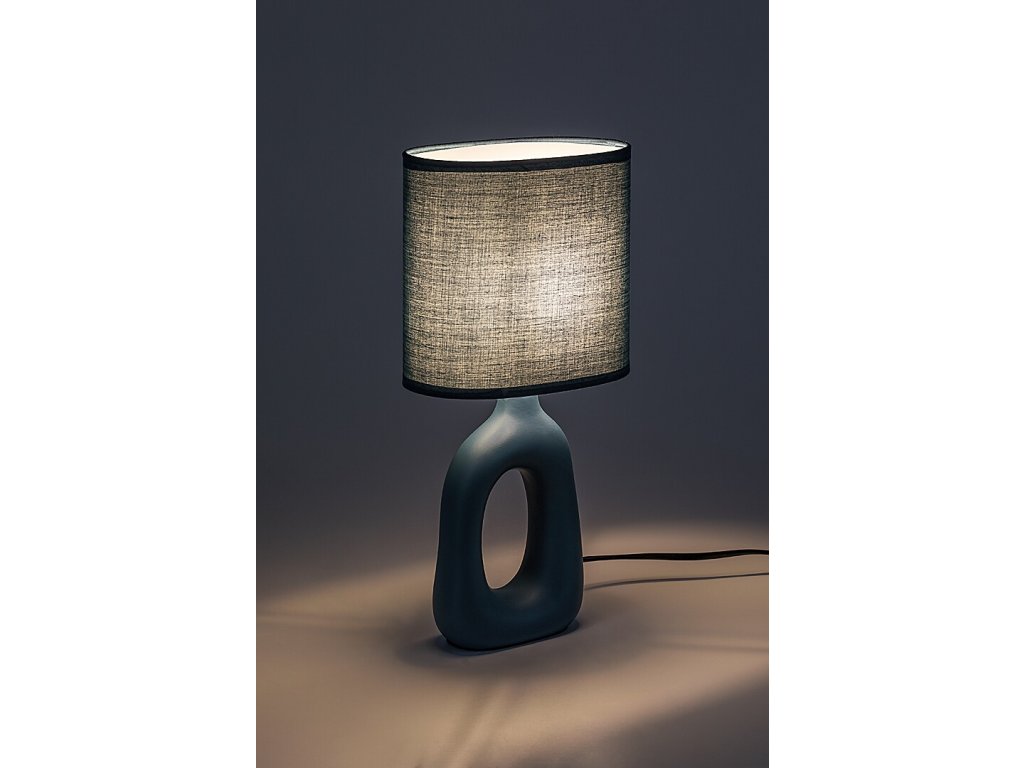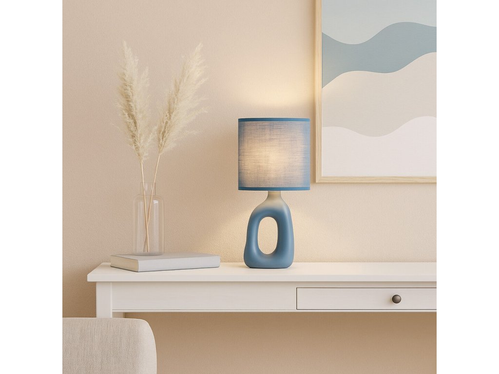 A Sylira kék színű asztali lámpa eredeti kerámia testével, középen hangsúlyos nyílással hívja fel magára a figyelmet, amely modern és elegáns hatást kelt. Az azonos színű, hengeres textil lámpabúra elegendő fényt enged át felülről és alulról, és harmonikus egészet alkot a kerámia testtel.