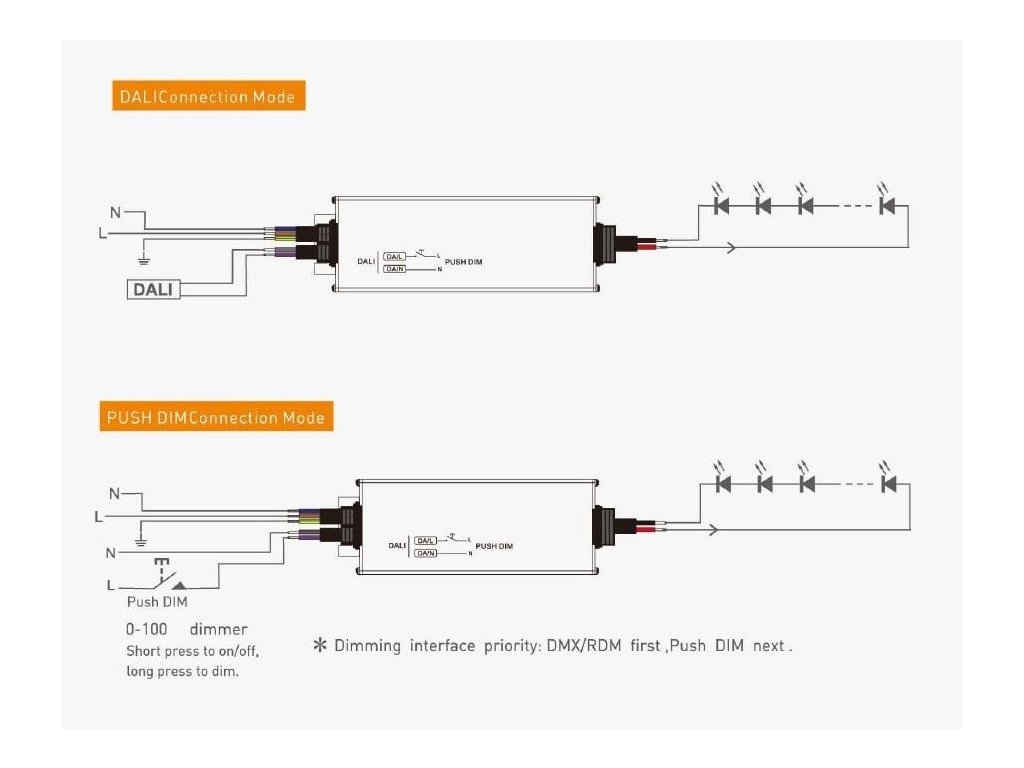 A fényerő kétféleképpen szabályozható – a szabványos DALI jel segítségével, amely lehetővé teszi a világítás professzionális vezérlőrendszerekbe való egyszerű integrálását, vagy egy gombbal (PUSH DIM), ahol egy rövid megnyomással be- vagy kikapcsolhatja a fényt, egy hosszú megnyomással pedig fokozatmentesen beállíthatja a kívánt fényerőt. Ez maximális rugalmasságot biztosít, akár egyszerű vezérlést, akár intelligens telepítésbe való teljes integrációt keres.