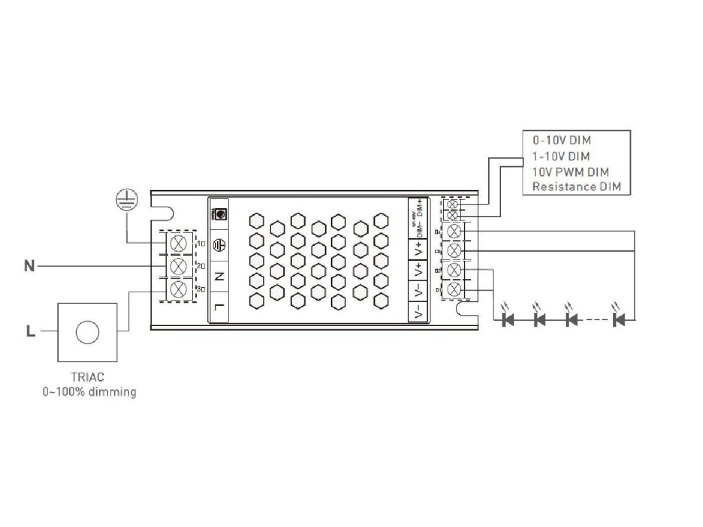 Ennek a tápegységnek az az előnye, hogy univerzálisan szabályozható, mivel több fényerőszabályozási módot is támogat. A fényerő klasszikus TRIAC fényerőszabályzóval, vagy 0–10 V, 1–10 V, 10 V PWM vezérlőjelekkel vagy 0–100 kΩ közötti ellenállással szabályozható. Ez lehetővé teszi a könnyű hozzáigazítást a konkrét rendszerhez és a környezethez, amelyben a világítás telepítve lesz.