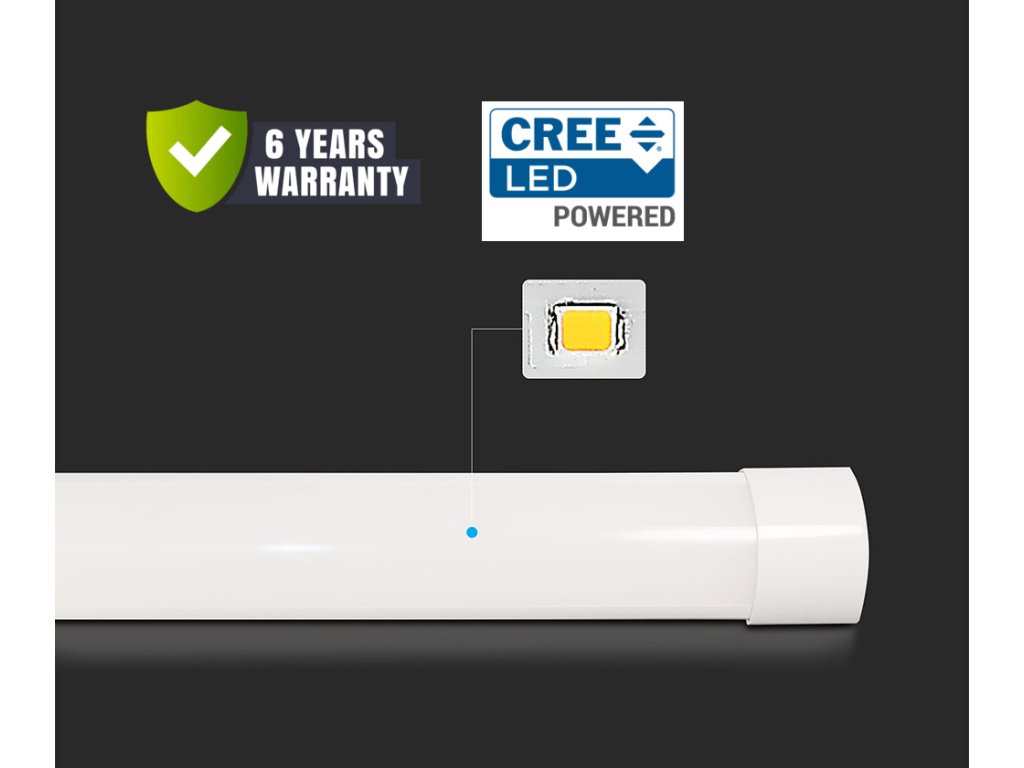A világítás minőségi SMD CREE LED chipeket használ, magas, akár 120 lm/W fényhasznosítással. A lámpatest azonnal 100%-os teljesítménnyel kapcsol be villogás és zavaró zajok nélkül, miközben akár 85%-kal kevesebb energiát fogyaszt, mint a hagyományos fénycsövek.