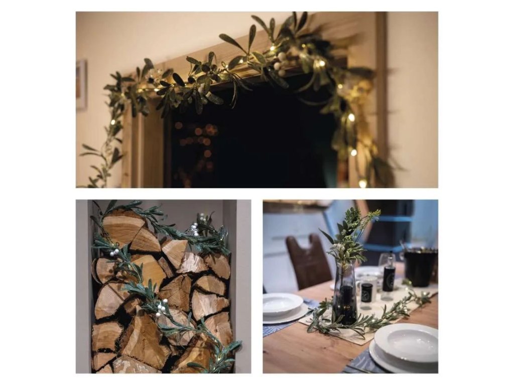 Fényfüzér műmályvával finom, ünnepi hangulatot varázsolhat a belső térbe, amely gyönyörűen kiegészíti az adventi dekorációt és a hétköznapi téli elrendezést is. A füzér teljes hosszában apró, meleg fehér színű LED diódák találhatók, amelyek kiemelik a levelek és bogyók szerkezetét, és természetesen elegáns megjelenést kölcsönöznek a dekorációnak. A fény lágyan és melegen hat, így tökéletesen alkalmas kandallópárkányra, ünnepi asztalra, ablakba vagy ajtókeretek köré.