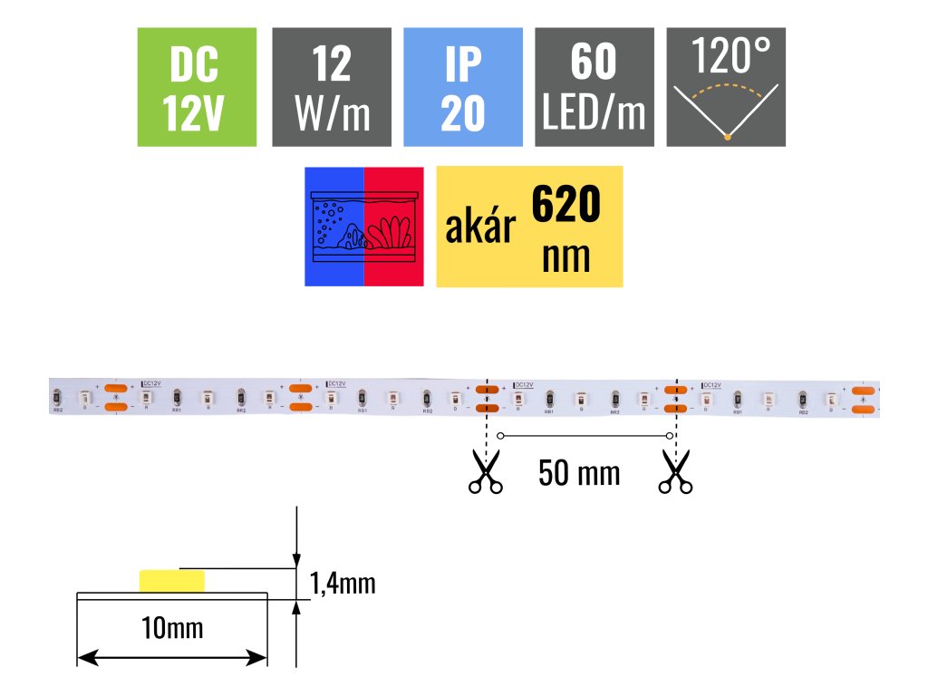 LED-szalag, 12W/m, 12V, védelem nélkül IP20, akváriumba