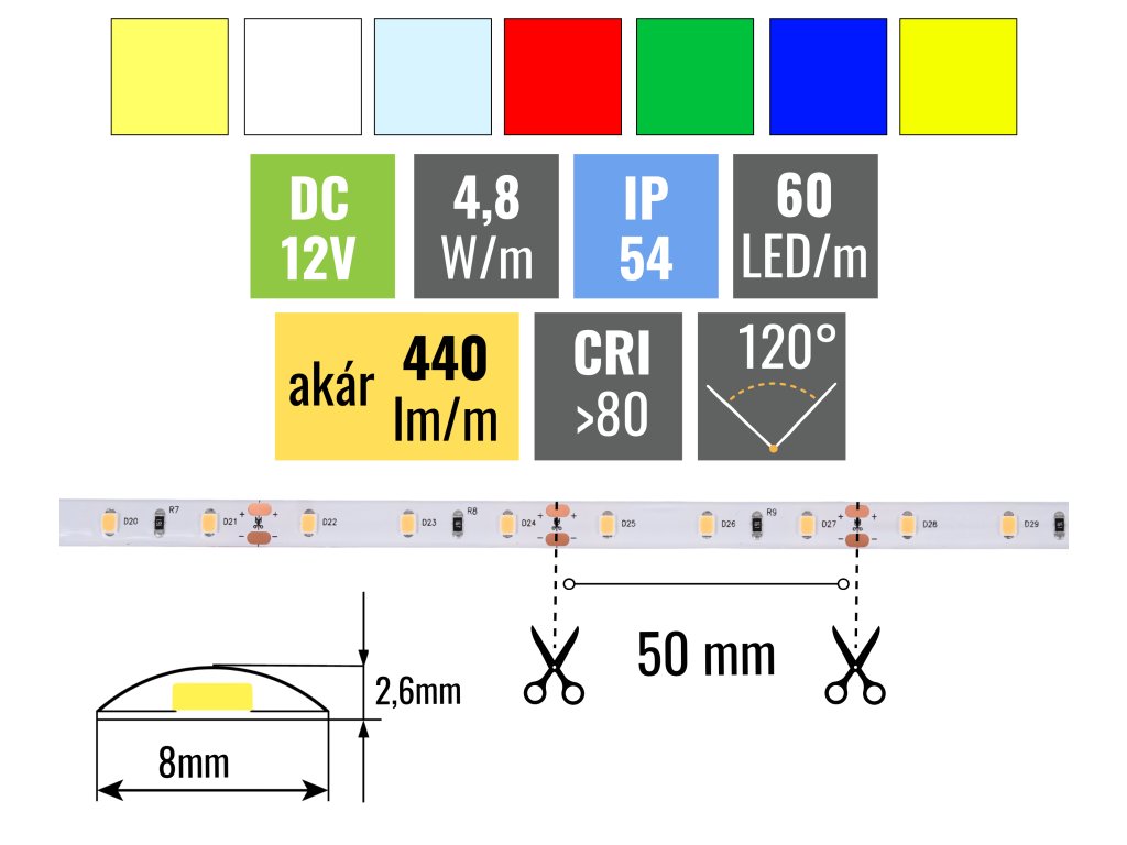 A 4,8W/m teljesítményből a szalag 440lm/m fényt állít elő. A LED diódák sűrűsége 60db/m, ennek köszönhetően a szalag teljes hosszában egyenletesen világít. Ezt a szalagot nem szükséges alumíniumsínbe ragasztani, ezért javasoljuk, hogy ezt a lépést fontolja meg. Minden szalagunk 3M 300LSE öntapadó fóliával van ellátva, amely kiválóan tapad az alaphoz. Az alapnak simának kell lennie és a szalag felragasztása előtt alaposan zsírtalanítani kell.