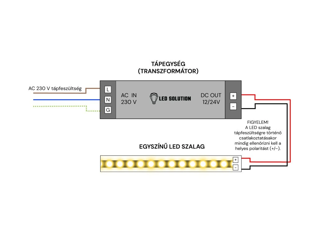 Amennyiben 10 méternél hosszabb LED-szalagot készül bekötni, javasoljuk a szalagot mindkét végéről táplálni, ezáltal nem kockáztatja a fényerősség látható csökkenését.
