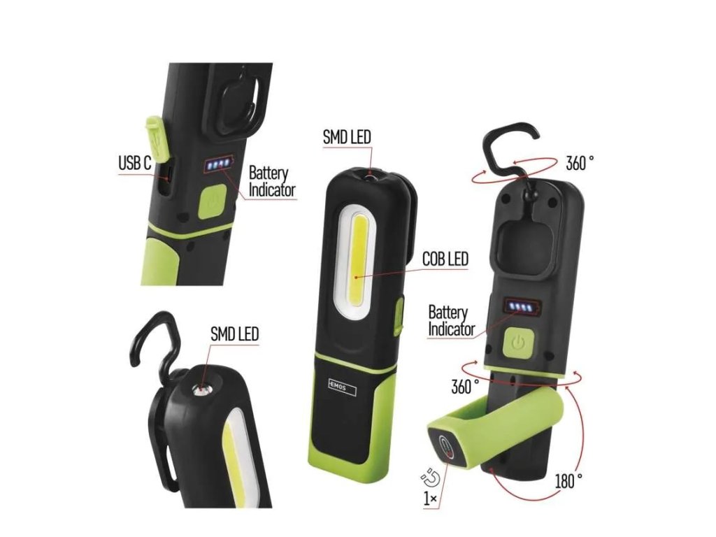 A lámpa tartós ABS műanyagból és gumiból készült szerkezettel rendelkezik, ütésálló és vízálló (IP43), így gond nélkül használható kevésbé kedvező körülmények között is. A praktikus elemek, mint például a forgatható fogantyú, a mágnes, a csipesz és a kihajtható akasztó lehetővé teszik a kényelmes elhelyezést és használatot anélkül, hogy kézben kellene tartani.