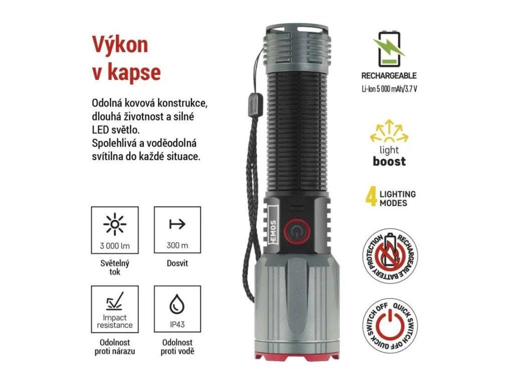 A nagy teljesítményű, újratölthető LED-es lámpa megbízható világítást kínál munkához, túrázáshoz és szabadidőhöz. A tartós fémház, a hosszú élettartam és az akár 3000 lumenes erős fényáram tökéletes áttekintést biztosít bármilyen körülmények között. A akár 300 méteres hatótávolság ideális választássá teszi műhelybe, nyaralóba és terepre.