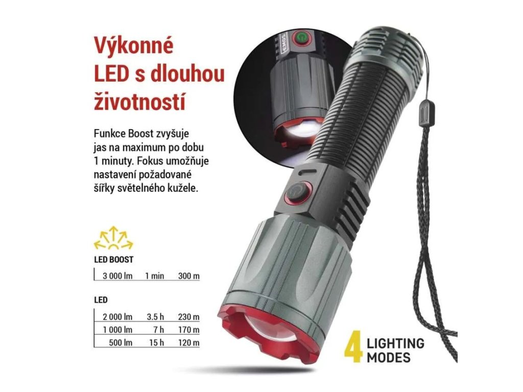 Négy világítási mód áll rendelkezésre – rövid távú BOOST maximális 3000 lm fényerővel, állandó 100%-os teljesítmény (2000 lm), energiatakarékos 50%-os üzemmód (1000 lm) és a leghosszabb üzemidő 20%-os módban (500 lm), amikor a lámpa akár 15 órán át is képes világítani. A gyors kikapcsolás funkció lehetővé teszi az azonnali kikapcsolást anélkül, hogy végig kellene menni az összes üzemmódon.