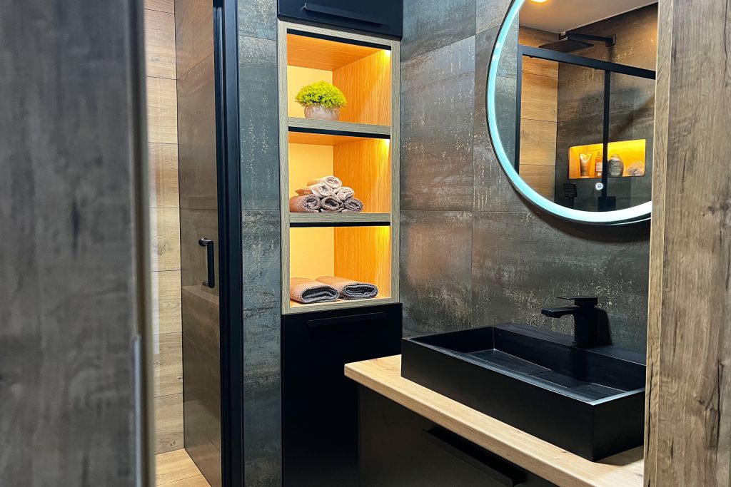 - Zóna 2 sahá do vzdálenosti 60 cm od vany nebo sprchy. Zde je vhodné volit svítidla s krytím alespoň IP54, ideálně na bezpečné nízké napětí. Typickým příkladem je osvětlení zrcadla nebo boční světla u umyvadla.