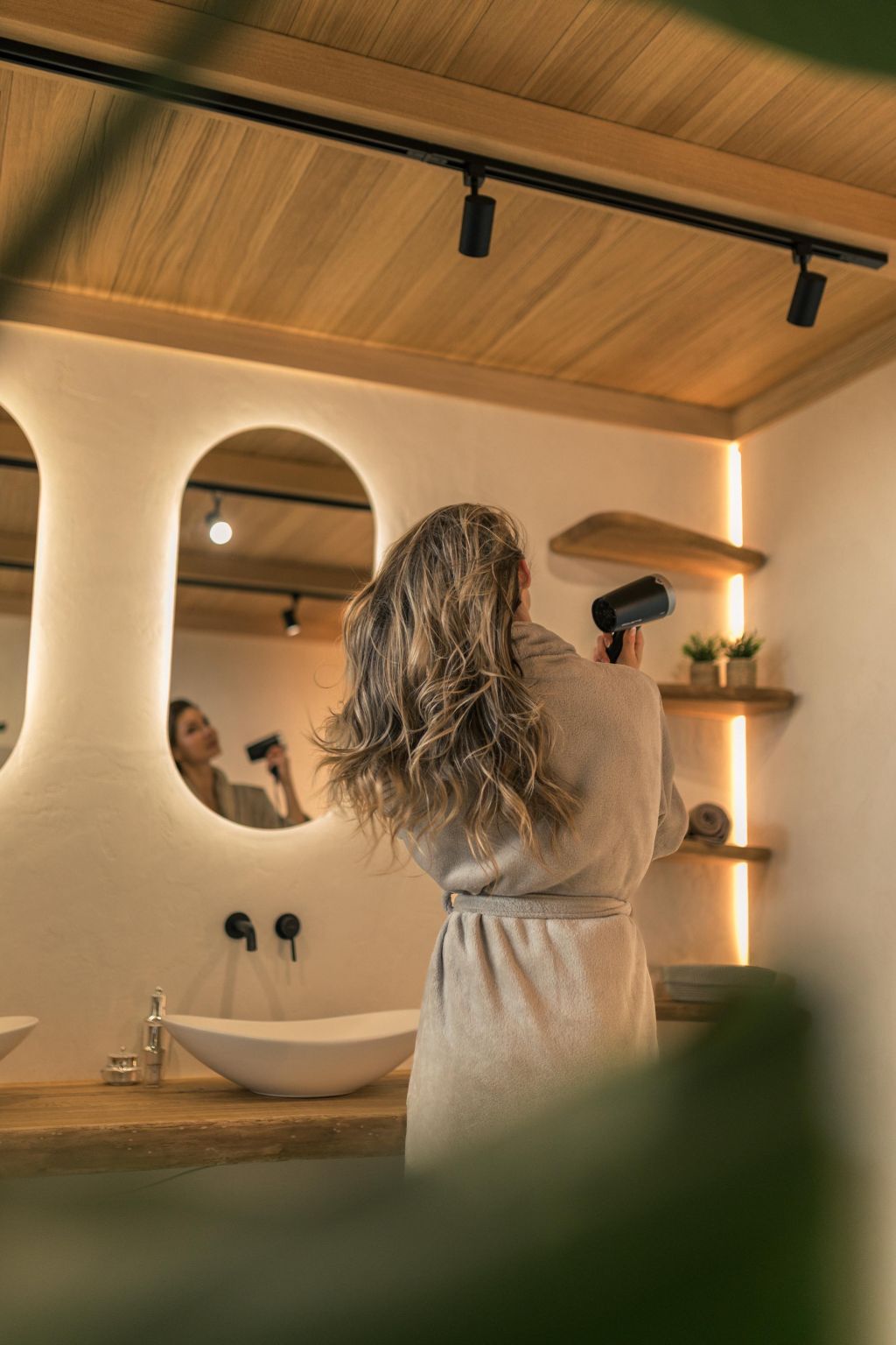 Studené světlo může v koupelně působit neosobně a tvrdě, zatímco příliš teplé světlo zkresluje podání barev při pohledu do zrcadla. Pro běžné používání je nejvhodnější denní bílá okolo 4000 K. Ideálním řešením je však kombinace různých barev světla podle účelu jednotlivých svítidel.