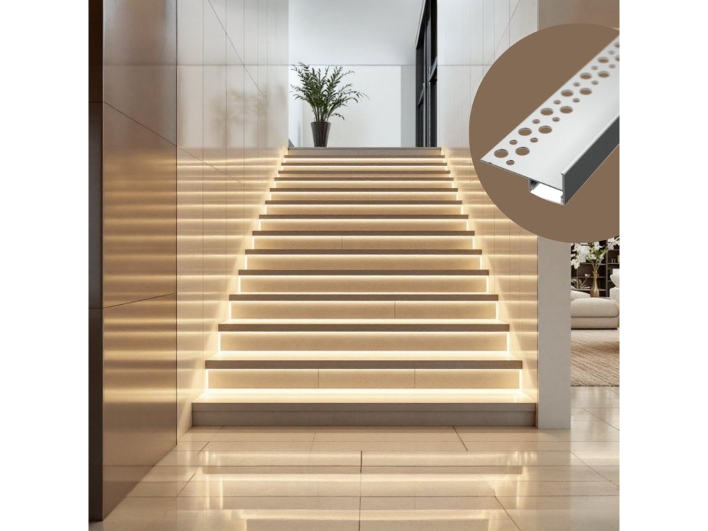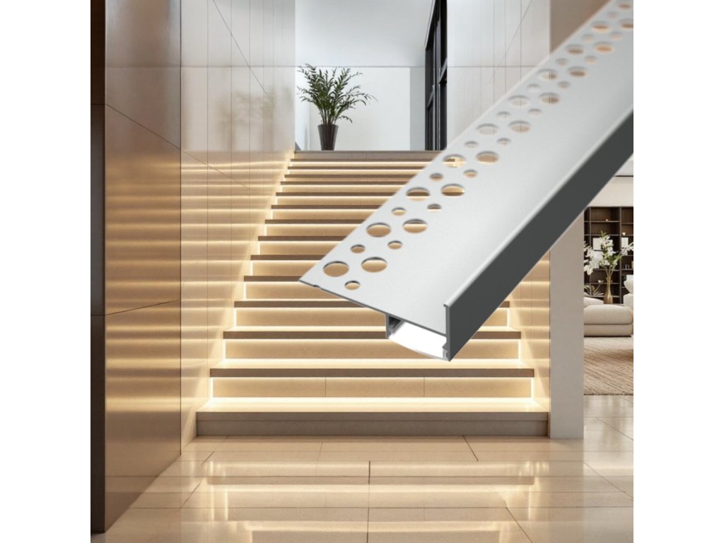 Az elegáns, alumínium lépcsőprofil, amelyet a csempe alá történő beépítésre terveztek, speciálisan úgy lett kialakítva, hogy tiszta és funkcionális lépcsőélt képezzen, miközben lehetővé teszi a LED szalag felszerelését a hatékony és biztonságos háttérvilágítás érdekében. Ennek a megoldásnak köszönhetően a fény a lépcsőszerkezet természetes részévé válik, és modern, diszkrét hatást kelt. A profil lakóterekben, kereskedelmi helyiségekben és szállodákban is használható, ahol a hangsúly az esztétikán és a biztonságon van.