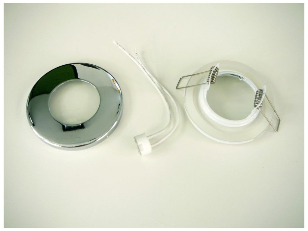 Egy króm színű fémkeretről van szó. A rugók segítségével a keret egyszerűbben rögzíthető a gipszkartonba. A gipszkartonlap fölött legalább 75mm résnek kell lennie az égőhöz és az aljzathoz. Egy megfizethető, mégis gazdaságos lámpaváltozatról van szó, amely a mennyezetekbe történő szerelésre alkalmas. A keret IP44 IP-védettséggel, tehát porral és vízzel szembeni védelemmel van ellátva, ezért alkalmas például fürdőszobába.