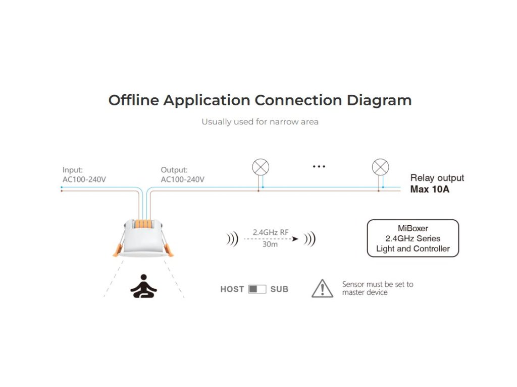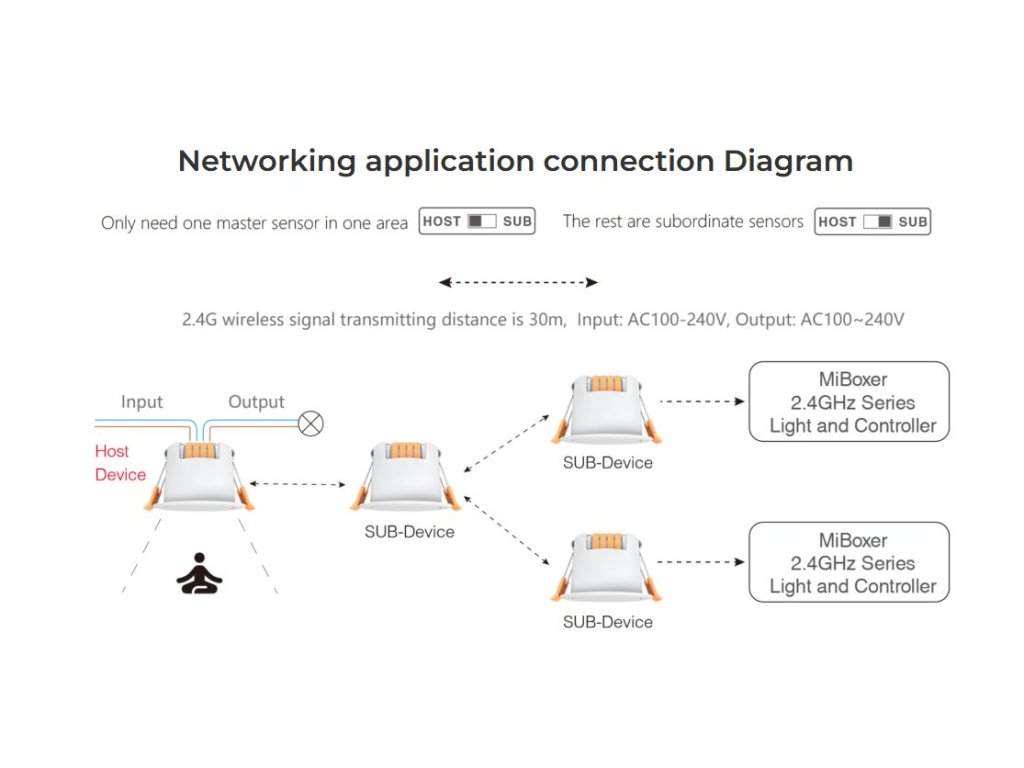 Az érzékelő önállóan is használható, vagy több egység összekapcsolható egy hálózatba, kiküszöbölve a vakfoltok kockázatát. A kommunikáció vezeték nélkül, 2,4 GHz-es frekvencián történik, akár 30 méteres hatótávolsággal, ami lehetővé teszi a MiBoxer okosrendszerbe való kényelmes integrációt. A tápellátás közvetlenül AC 230 V-ról történik, így a telepítés gyors és nem igényel külön tartozékokat.