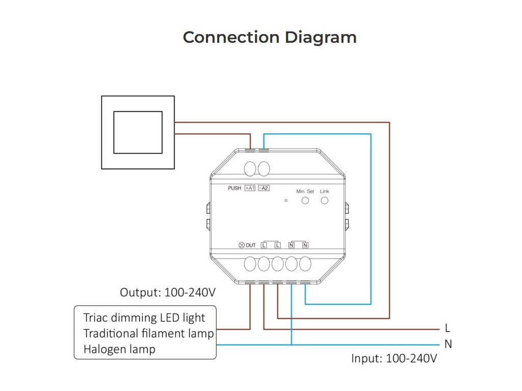 Mi-Light / MiBoxer fényerő-szabályozó és jelvevő AC 230V-ra működő, szabályozható fényerősségű LED-lámpákhoz. A fényerő-szabályozó/jelvevő elrejthető (fal mögött, gipszkarton mögött vagy a szekrényben), nem kell feltétlenül láthatónak lennie a vezérlő számára.