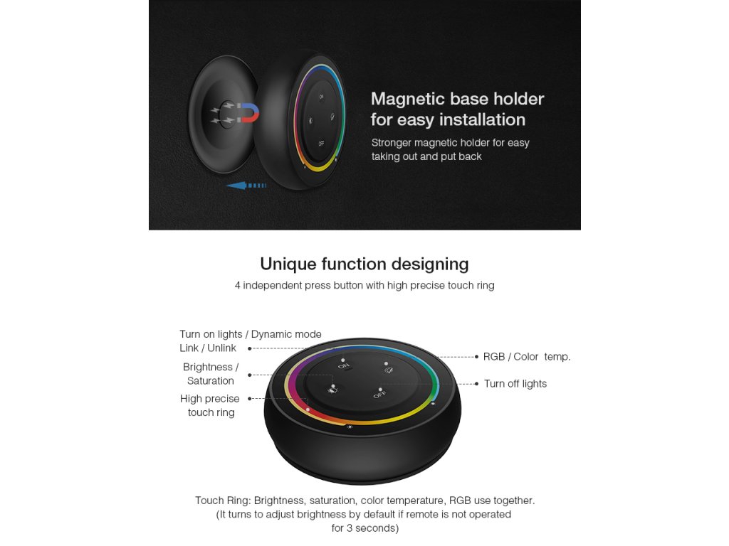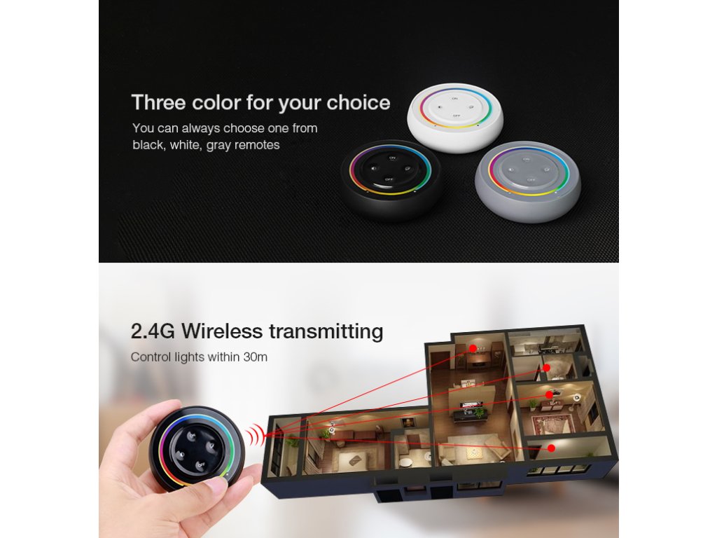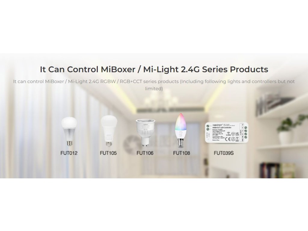 A Mi-Light fali távirányító/fényerő-szabályozó RGB + CCT LED-szalagokhoz egy vezeték nélküli rádiófrekvenciás vezérlőrendszer a Mi-Light / MiBoxer termékcsaládokhoz. Egy vezérlővel 1 fényzóna vezérelhető, amely több jelvevőből állhat. Ezek a jelvevők a vezérlővel való összehangolásukat követően egy szekcióként vezérelhetők.