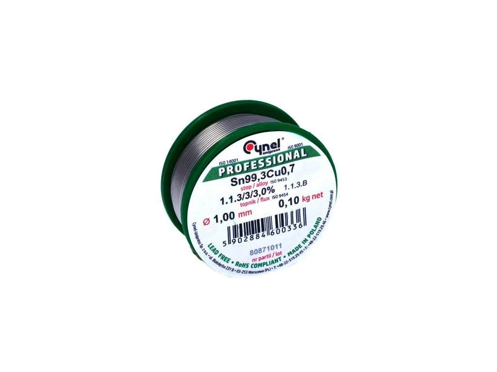 Óncsöves forrasztó 1,0 mm átmérővel; ólommentes; a forrasztó ón összetétele 99,3% + réz 0,7% + NoClean folyasztószer; olvadáspont 227°C.