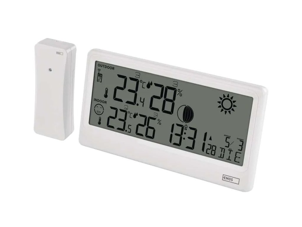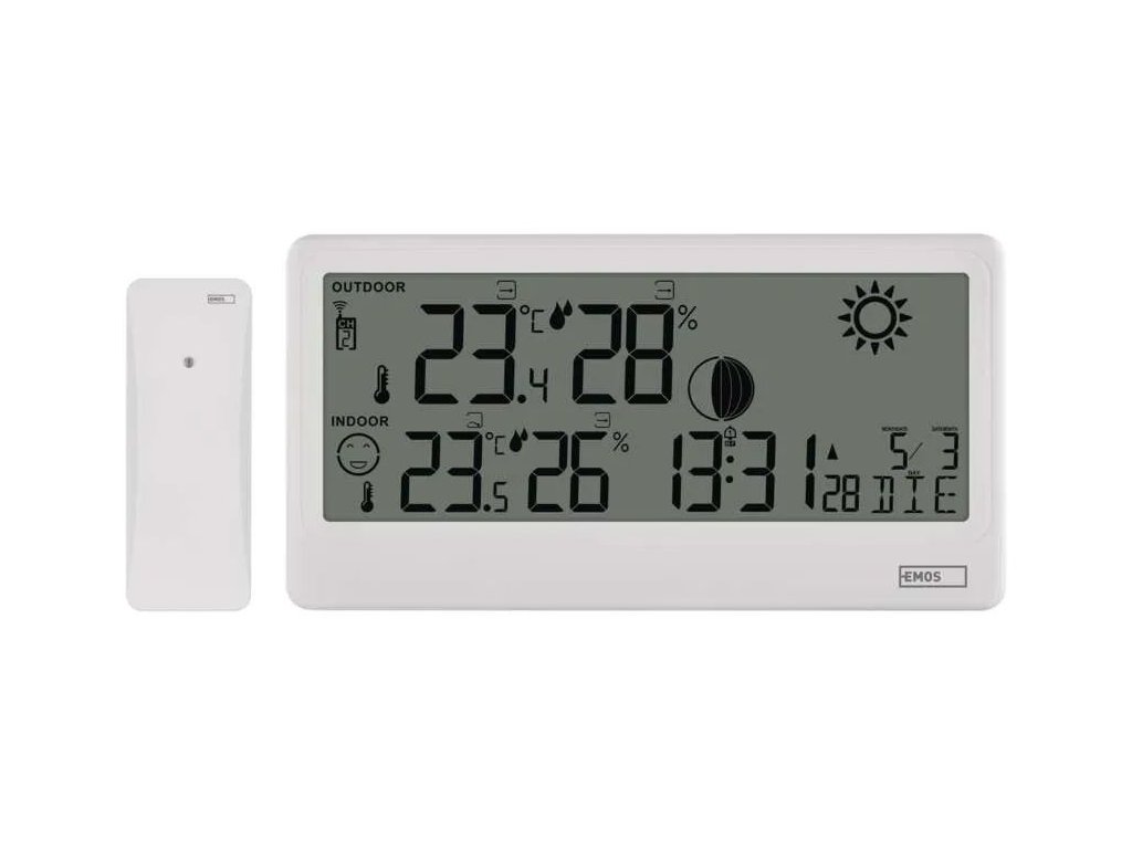 A modern vezeték nélküli E0531 időjárásálló állomás nagy, áttekinthető kijelzővel ideális segédeszköz a hőmérséklet és a páratartalom beltéri és kültéri figyeléséhez. A jelenlegi értékeken kívül a hőmérséklet alakulását, az időjárás-előrejelzést, a holdfázisokat és a fagyveszélyre figyelmeztetést is megjeleníti. A penészedés elleni figyelmeztetés funkciónak köszönhetően mindig optimális körülményeket biztosíthat otthonában.