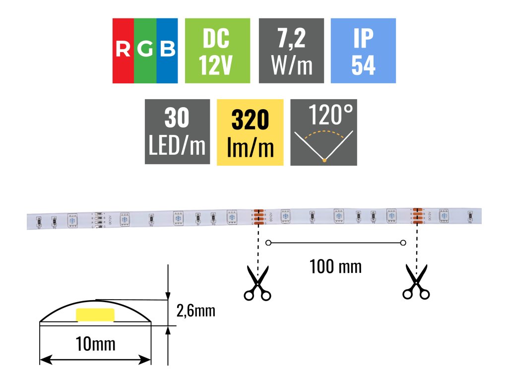 A 7,2W/m teljesítményből a szalag 320lm/m fényt állít elő. A LED diódák sűrűsége 30db/m, ennek köszönhetően a szalag teljes hosszában egyenletesen világít. Ezt a szalagot, a LED diódákból származó hő elvezetése miatt, alumíniumsínbe kell ragasztani. Minden szalagunk 3M 300LSE öntapadó fóliával van ellátva, amely kiválóan tapad az alaphoz. Az alapnak simának kell lennie és a szalag felragasztása előtt alaposan zsírtalanítani kell.