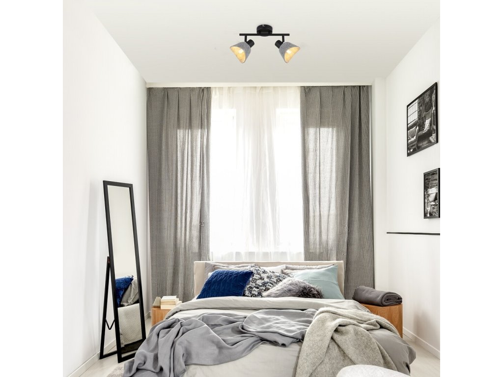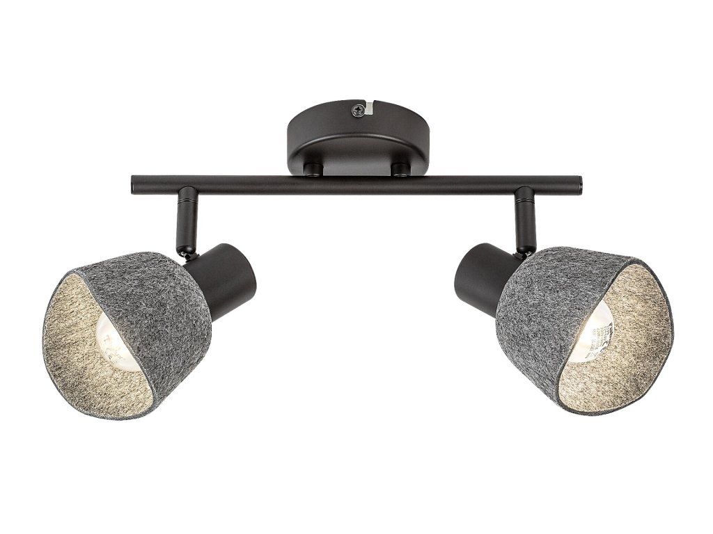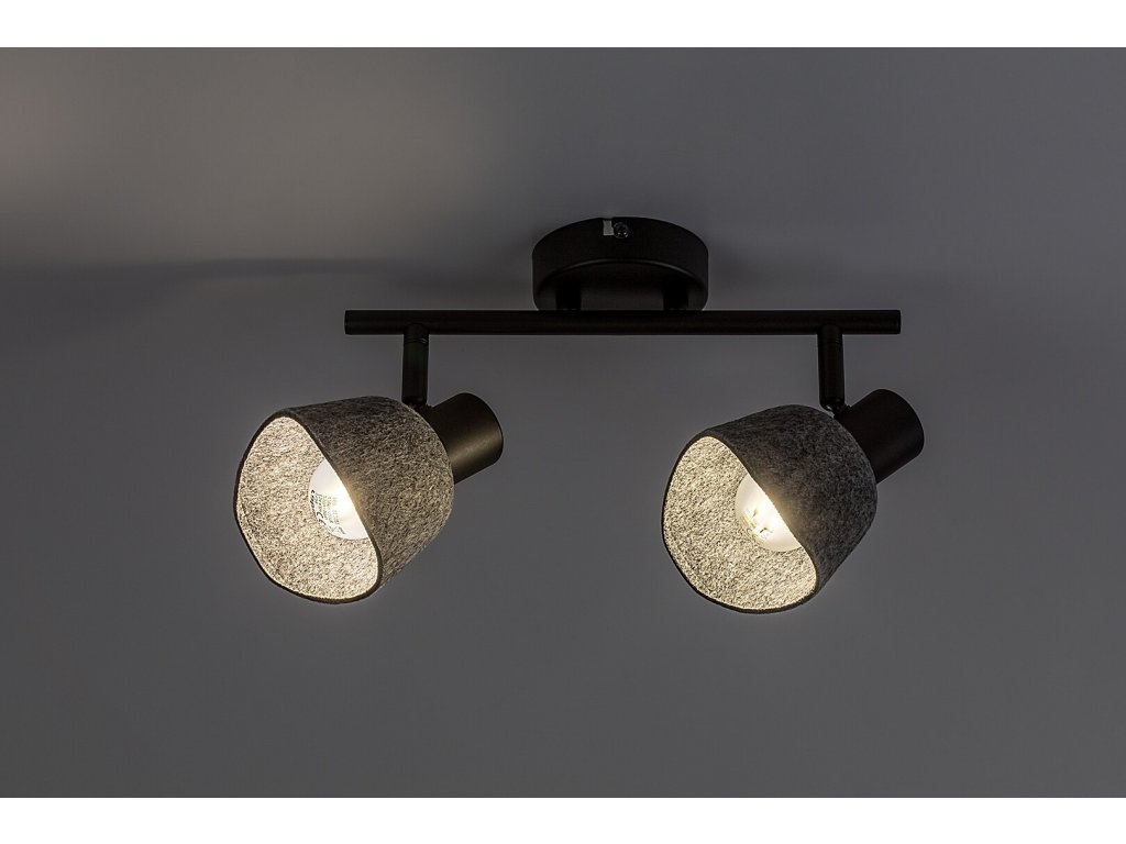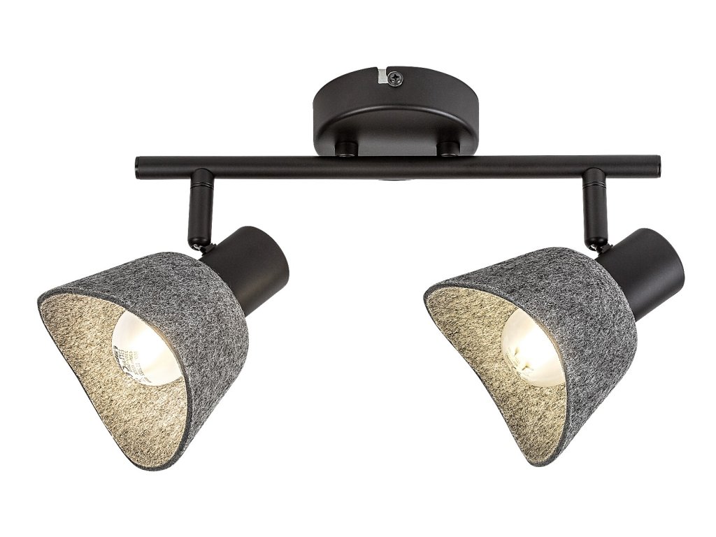 A mennyezeti Farelia spotlámpa két fényforrással eredeti formájával és szokatlan anyagkombinációjával nyűgöz le, amely nyugodt és otthonos légkört visz a belső térbe. A domináns elem a szürke filc lámpabúra, harang alakú, finoman ívelt profillal, környezetbarát újrahasznosított anyagból. A filc puha felülete meleg és természetes hatást kelt, míg a fekete fém konstrukció modern kontrasztot kölcsönöz a lámpatestnek, és biztosítja a stabil rögzítést a mennyezethez.