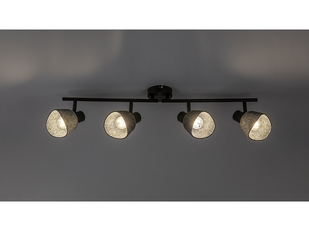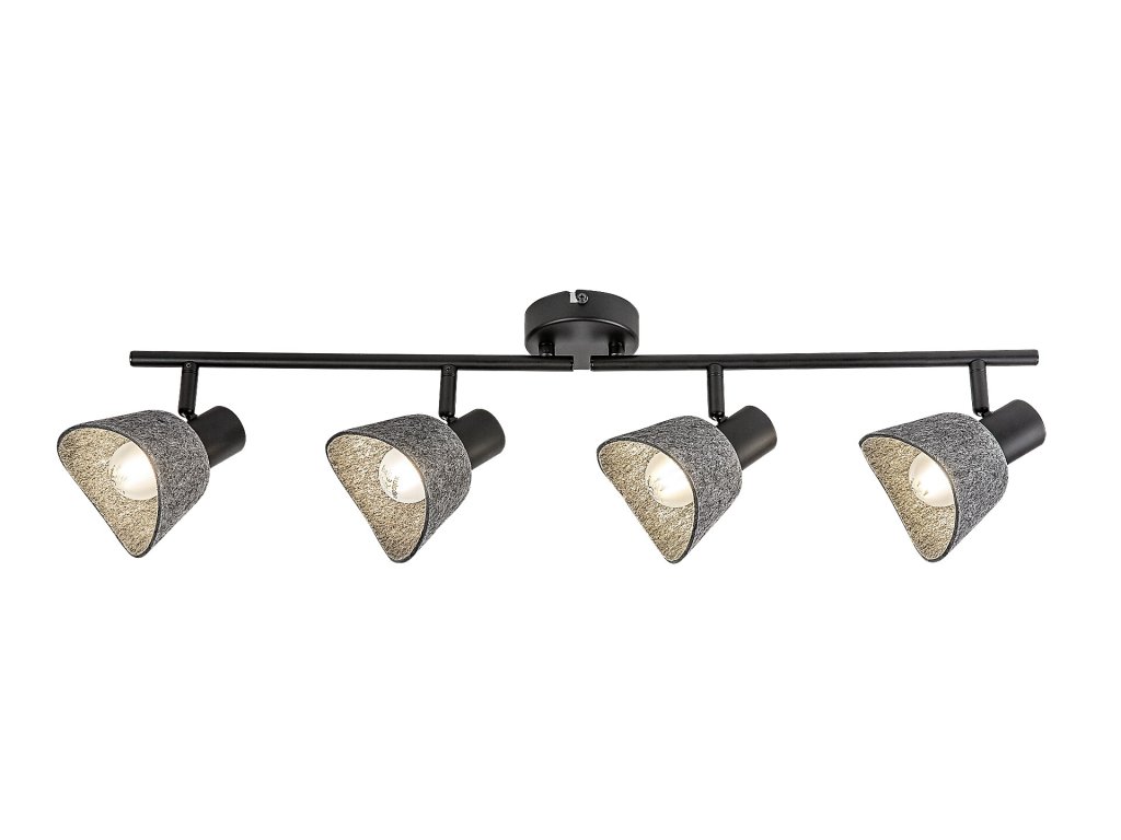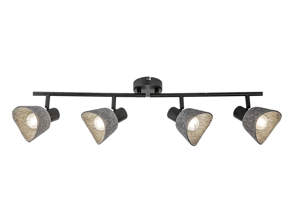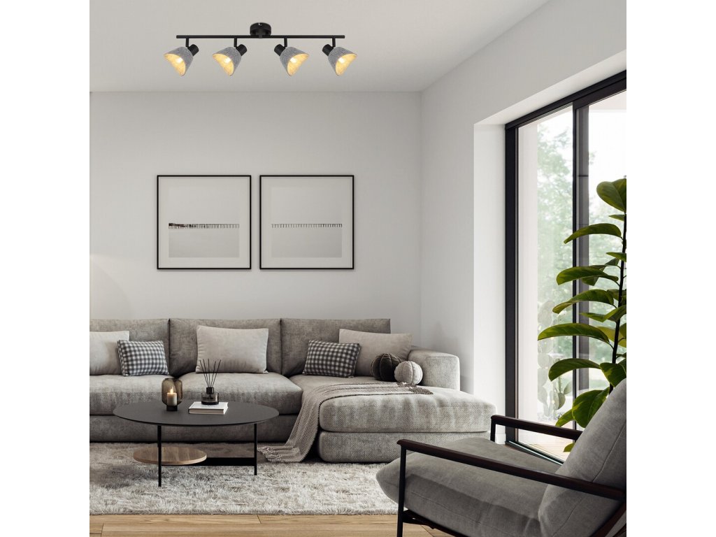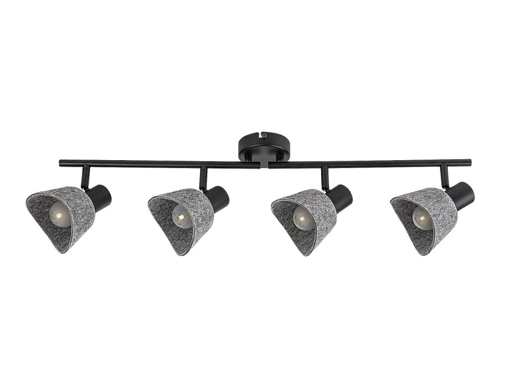 A Farelia mennyezeti spotlámpa négy fényforrással, eredeti formájával és szokatlan anyagkombinációjával hódít, amely nyugodt és otthonos légkört teremt a belső térben. A domináns elem a szürke filc lámpabúra, harang alakú, finoman ívelt profillal, környezetbarát újrahasznosított anyagból. A filc puha felülete meleg és természetes hatást kelt, míg a fekete fém konstrukció modern kontrasztot kölcsönöz a lámpatestnek, és biztosítja a stabil rögzítést a mennyezethez.