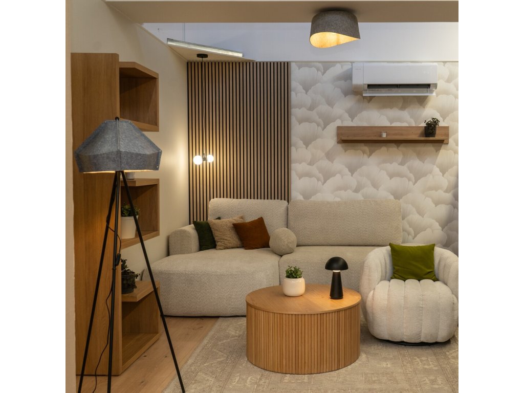 A Farelia mennyezeti lámpa eredeti formájával és a nem szokványos anyagkombinációval nyűgöz le, melynek köszönhetően nem csupán funkcionális, de feltűnő dizájn elemmé is válik a belső térben. A lámpa domináns eleme a szürke filc lámpaernyő harang alakú, finoman formázott peremmel, környezetbarát újrahasznosított anyagból. Ez a természetes felület lágy, meleg karaktert kölcsönöz a lámpának, miközben kiemeli annak fenntartható eredetét. A fekete fémből készült szerkezet diszkrét kontrasztot kölcsönöz az összképnek, és egy kis kerek szerelőalap segítségével stabil rögzítést biztosít a mennyezethez.