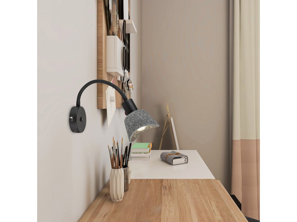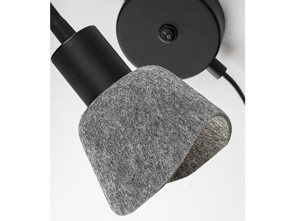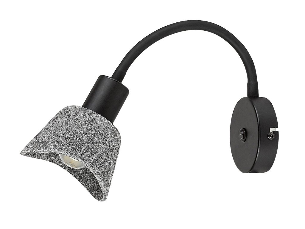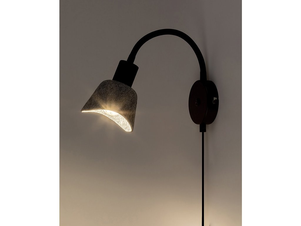 A Farelia falra szerelhető spotlámpa, flexibilis karral, funkcionális olvasólámpát ötvöz finom, otthonos megjelenéssel. A fekete színű fémkonstrukciót szürke filc lámpabúra egészíti ki, amely lágyítja a fényt és dekoratív megjelenést kölcsönöz. A filc anyag újrahasznosított anyagokból készült, és kiemeli a lámpa természetes karakterét.