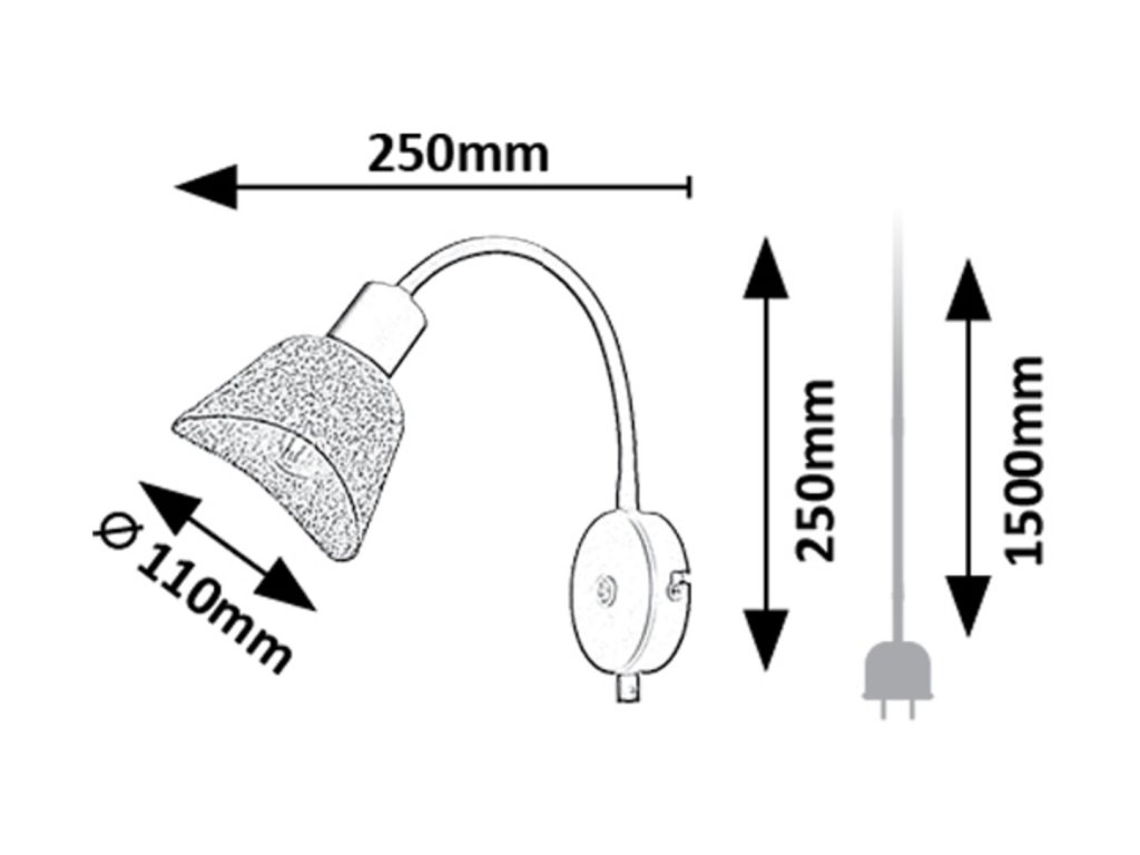 A lámpa teljes hossza megközelítőleg 250 mm. A lámpabúra átmérője 110 mm, a falikar alap átmérője pedig 90 mm. A tápkábel hossza eléri az 1500 mm-t.