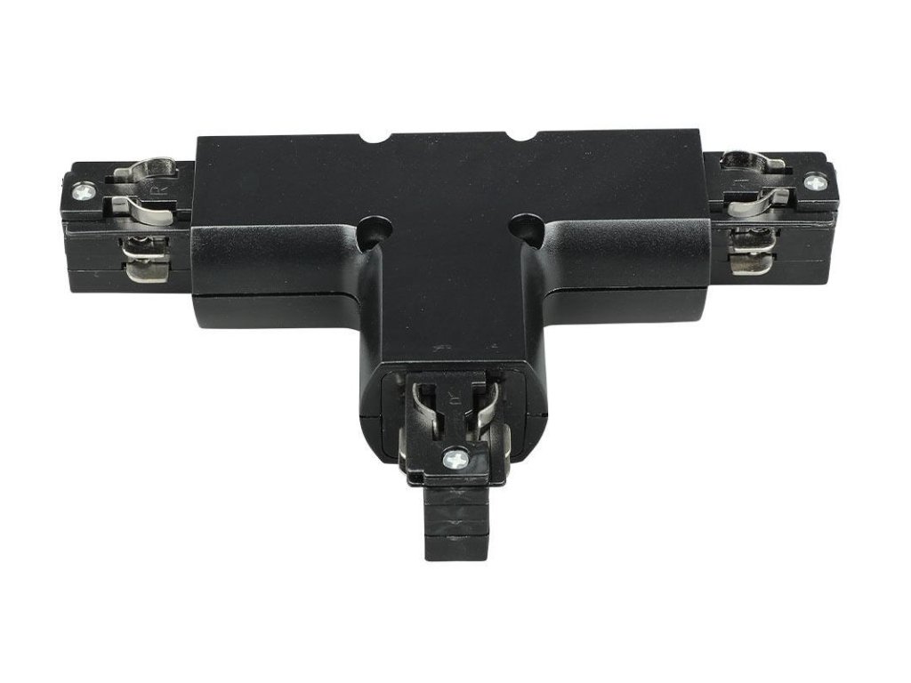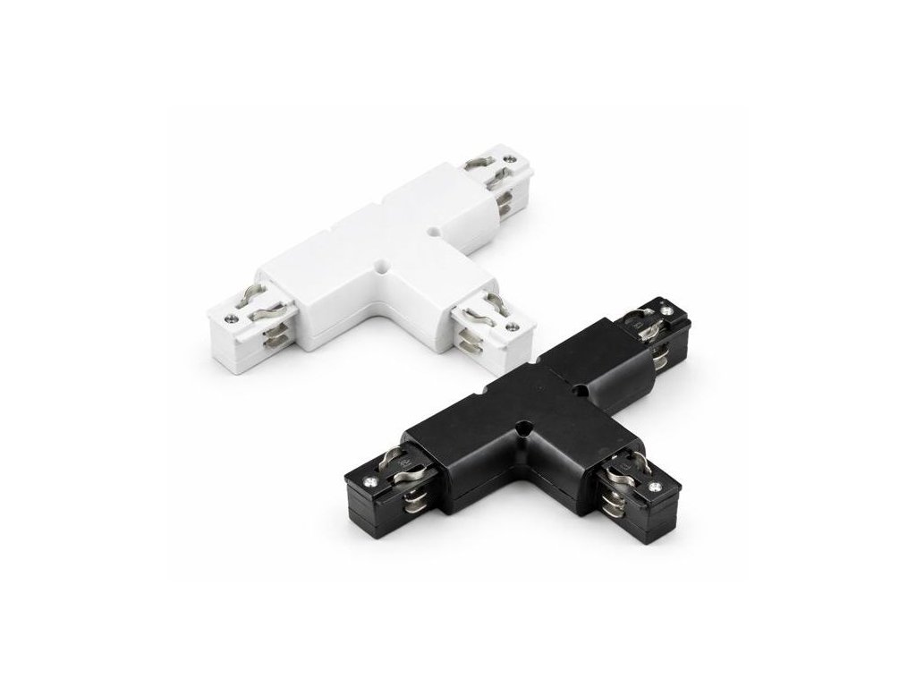T-alakú összekötőelem csatlakozóval AC 230V-os háromfázisú vezetősínhez, fekete és fehér színben választható.