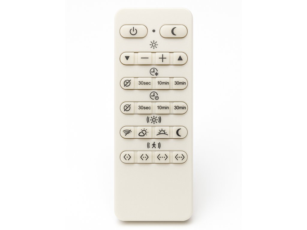 A távirányító segítségével könnyedén beállíthatja a lámpatest fényerejét 10%-tól a teljesítményig, kiválaszthatja az éjszakai fény funkciót állandó 10%-os teljesítménnyel, vagy beállíthatja a világítási időt mozgásérzékelés után (5/10/30 perc). Az készenléti üzemmód hosszának és szintjének, a környezeti nappali fény küszöbértékének (a teljes nappali fénytől a szürkületig) és az érzékelő hatótávolságának beállítására is lehetőség van körülbelül 1 és 7 méter között.