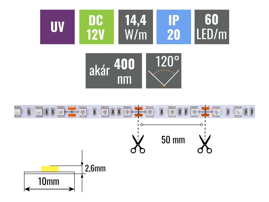 UV LED-szalag, 14.4W/m, 12V, védelem nélkül IP20