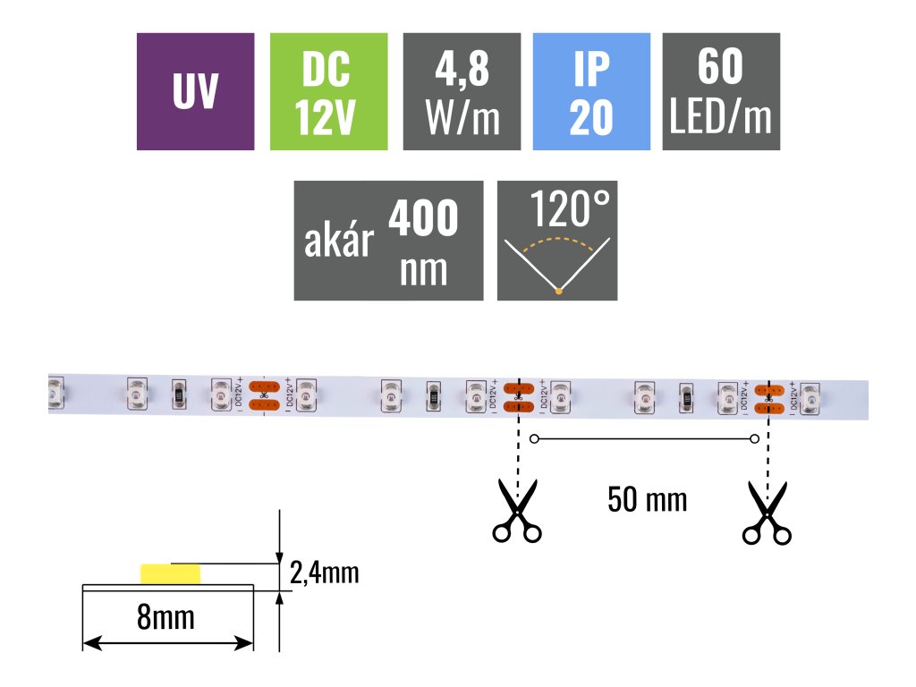 UV LED-szalag, 4.8W/m, 12V, védelem nélkül IP20