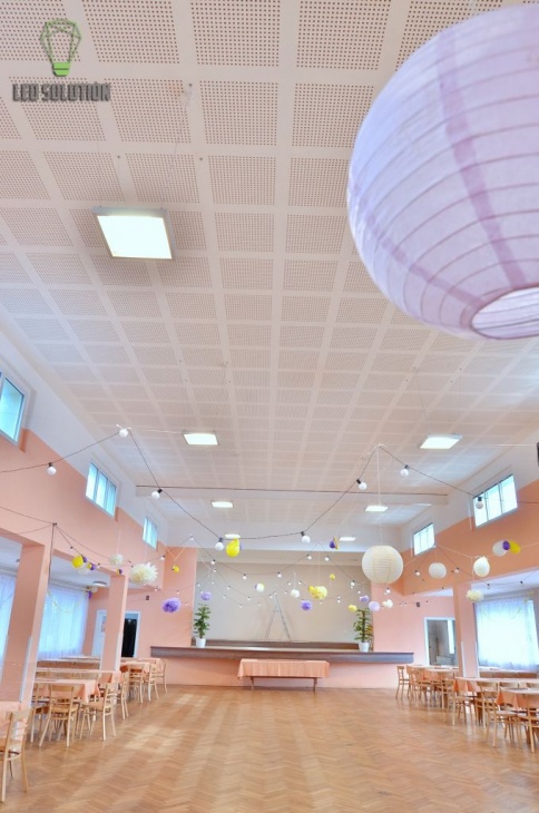 A kultúrcsarnok felújítása során először kidolgoztuk a világítási projektet, amelyben az érvényes szabványok alapján meghatároztuk a lámpák ideális számát és teljesítményét. A lámpák megrendelésre készültek Csehországban meghosszabbított, 5 év garanciával. A projektet a LED Solution s.r.o. társaság kulcsrakész megoldásként valósította meg, beleértve a beszerelést is. Bár a LED-lámpák teljesítménye jelentősebben nem haladja meg az eredeti égők teljesítményét, de a kisugárzott fényszint jelentősen megnőtt.